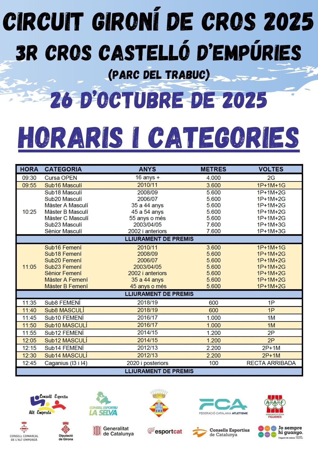- Les curses s'iniciaran a les 09:30h amb la Sortida OPEN i s'acabaran a es 12:45h.